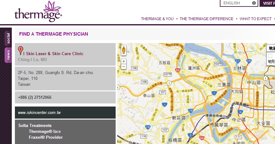 ▲ 在國外原廠Thermage的網頁上,也可以查詢到iSkin盧靜怡皮膚專科診所是台灣區合格的醫師名單!