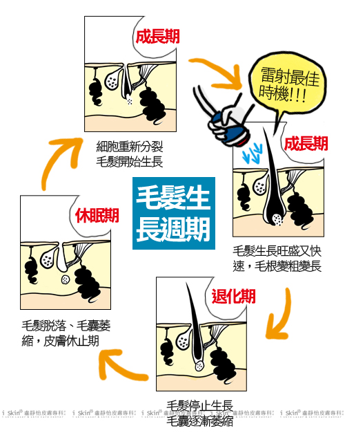毛髮生長有三個階段:成長期、退化期、和休止期。其中黑色素只在成長期出現,因此每次雷射並不能對所有的毛囊產生破壞效果,只能針對正在成長期的毛囊作用,事實上大部分的除毛方式也都是針對正在生長的毛髮做去除。退化期與休止期的毛囊對雷射光束沒有反應,因此每次雷射後應休息1.5個月~2個月讓毛髮生長再進行下一次雷射才能確實達到效果,以這樣的週期計算,包年其實也僅能進行5~6次療程,與一般所需次數實際上並沒有太多差異。